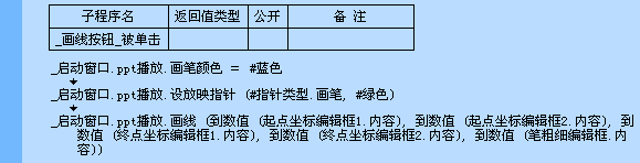 语法: 逻辑型 PPT播放.画线 (起点横坐标,起点纵坐标,终点横坐标,终点纵坐标,宽度)