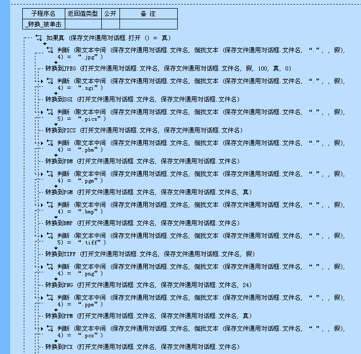 使用文本操作命令将欲保存文件的扩展名取出,如果扩展名为“.pics”,则通过“转换为PICS”命令,将bmp等图片格式转换为pics格式。