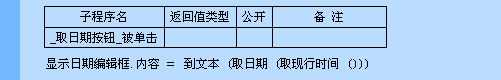 取出现行时间中的日期部分,显示在编辑框中。如果只需要日期中的年月日部分,用“取日期”命令是非常方便的,但要注意命令的返回值是一个日期时间型的数据。