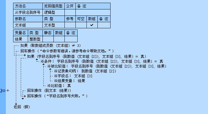 语法: 逻辑型 字段名到序号 (记录集句柄,字段名,结果变量)